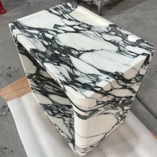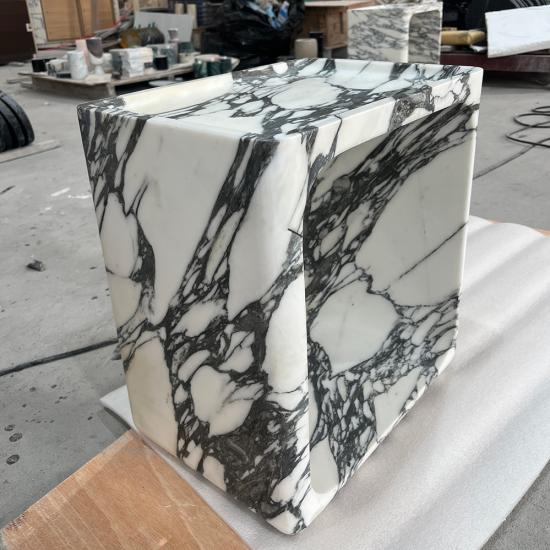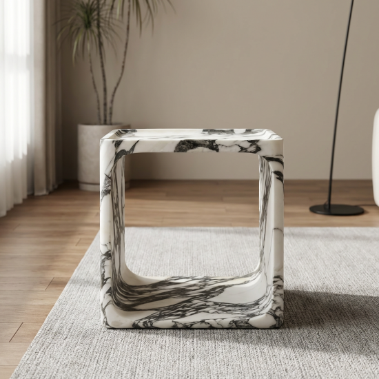 طاولة قهوة مربعة مجوفة منحوتة من رخام كالاكاتا فيولا، تعيد تعريف الفخامة العصرية بتصميمها المعماري الجريء وجمال الحجر الطبيعي الخالد. يمنحها تصميمها المجوف ثباتًا ومتانةً استثنائيين، مع إضافة لمسة من الخفة البصرية والجاذبية المعمارية لأي مساحة.