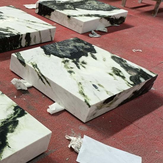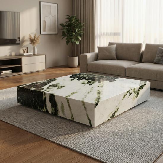 طاولة قهوة مستطيلة خضراء من الرخام مصنوع من رخام اليشم البارد الطبيعي. يتميز بلمعان دافئ وبريق يشبه اليشم. بعد التلميع، يصبح ذا ملمس ناعم. تتداخل ألوانه الأسود والأبيض والأخضر بأسلوب فريد. وهو حجر شائع في التصاميم العصرية الفاخرة والبسيطة ذات الطابع الإيطالي.
