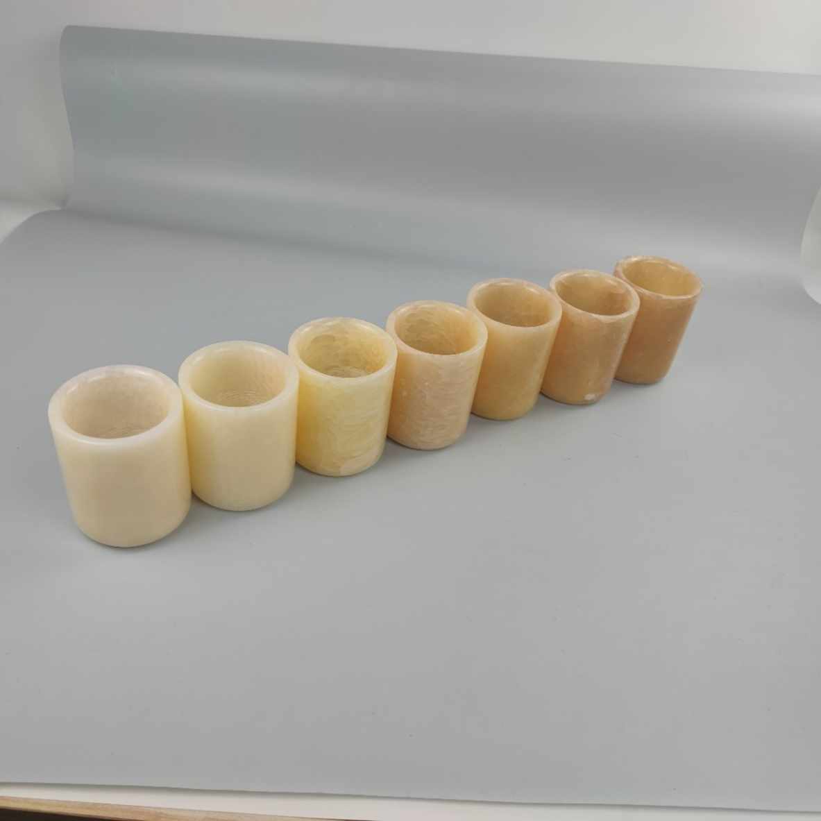 مصنفة باليد من Onyx الأصفر الطبيعي، شكل اسطوانة يسمح بمزيد من المياه الشمع شكل آخر من شمعة جرة. مباراة مثالية مع أغطية ذهبية روز أو Onyx غطاء.
